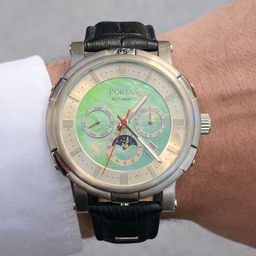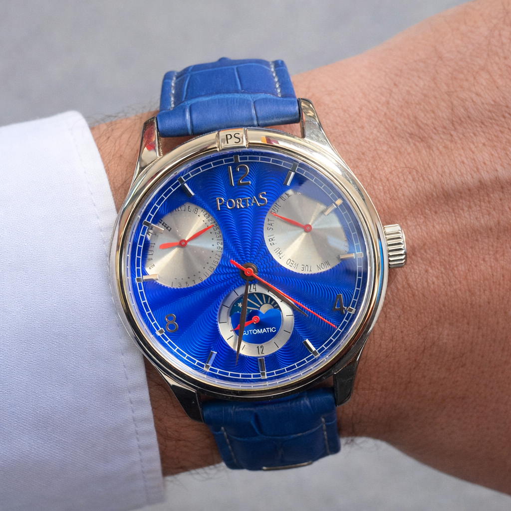 Elegant Skeleton Automatic Men’s Watch with Full Calendar German Brand Portas This automatic watch is equipped with a movement featuring 29 jewels, a sign of a finely engineered mechanical construction. Jewels (synthetic rubies) are used at critical friction points within the movement to reduce wear, improve durability and ensure smoother, more precise operation over time….
