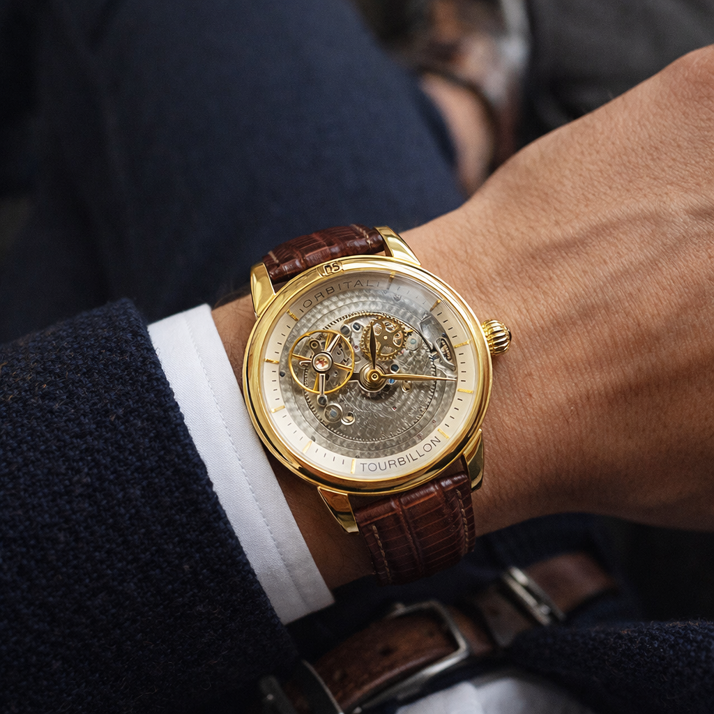 Exklusive Portas Automatikuhr mit sichtbarem Tourbillon, orbitalem Skelett-Zifferblatt und goldfarbenem Gehäuse. Luxuriöse Uhrmacherkunst mit braunem Echtlederarmband.