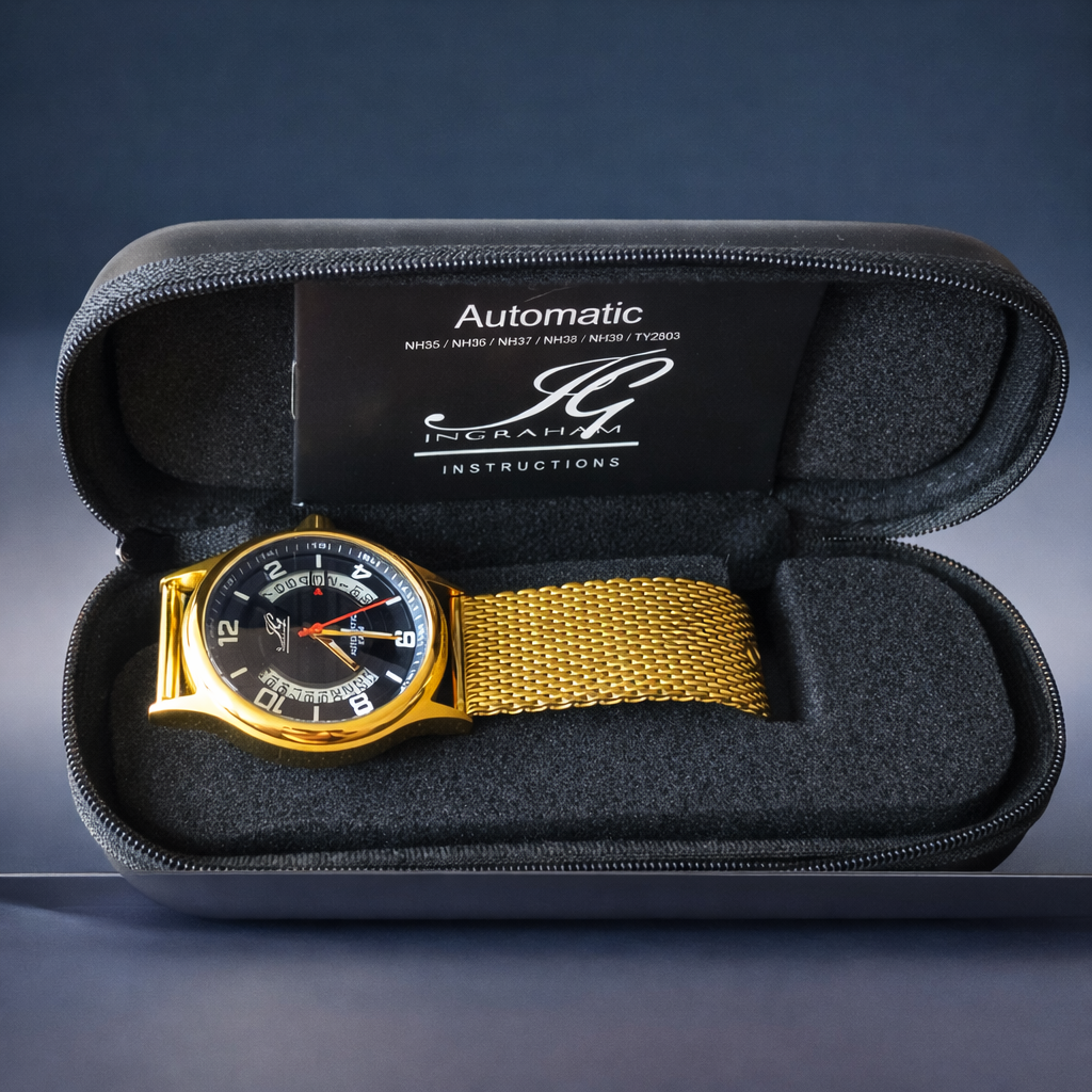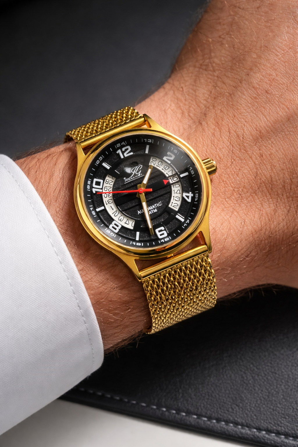 Automatic- 24 Jewels The gold-toned case paired with a black dial, clear Arabic numerals, date display, and a red second hand creates a distinctive and refined appearance.