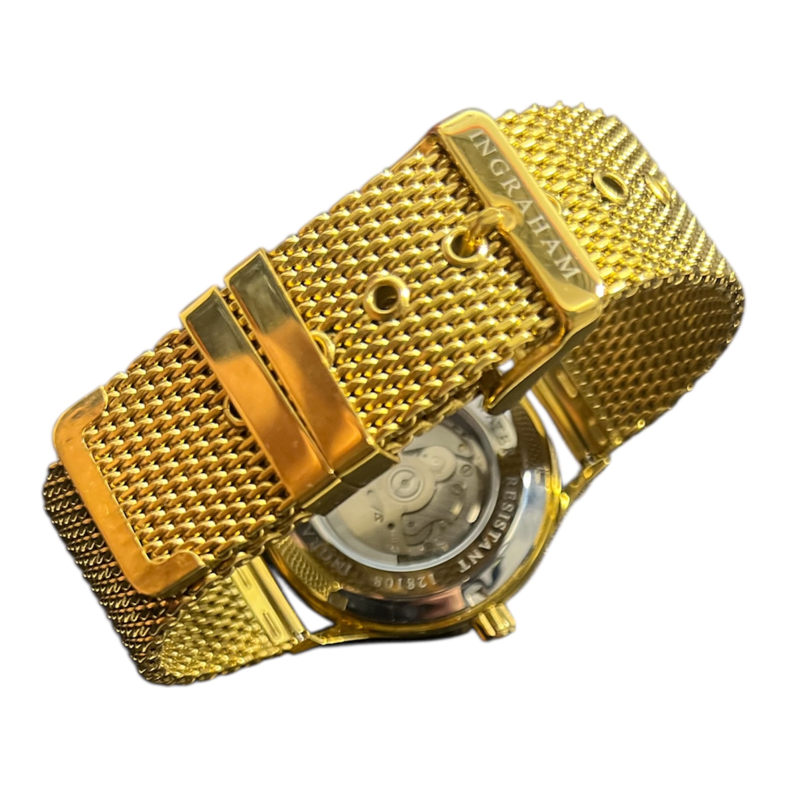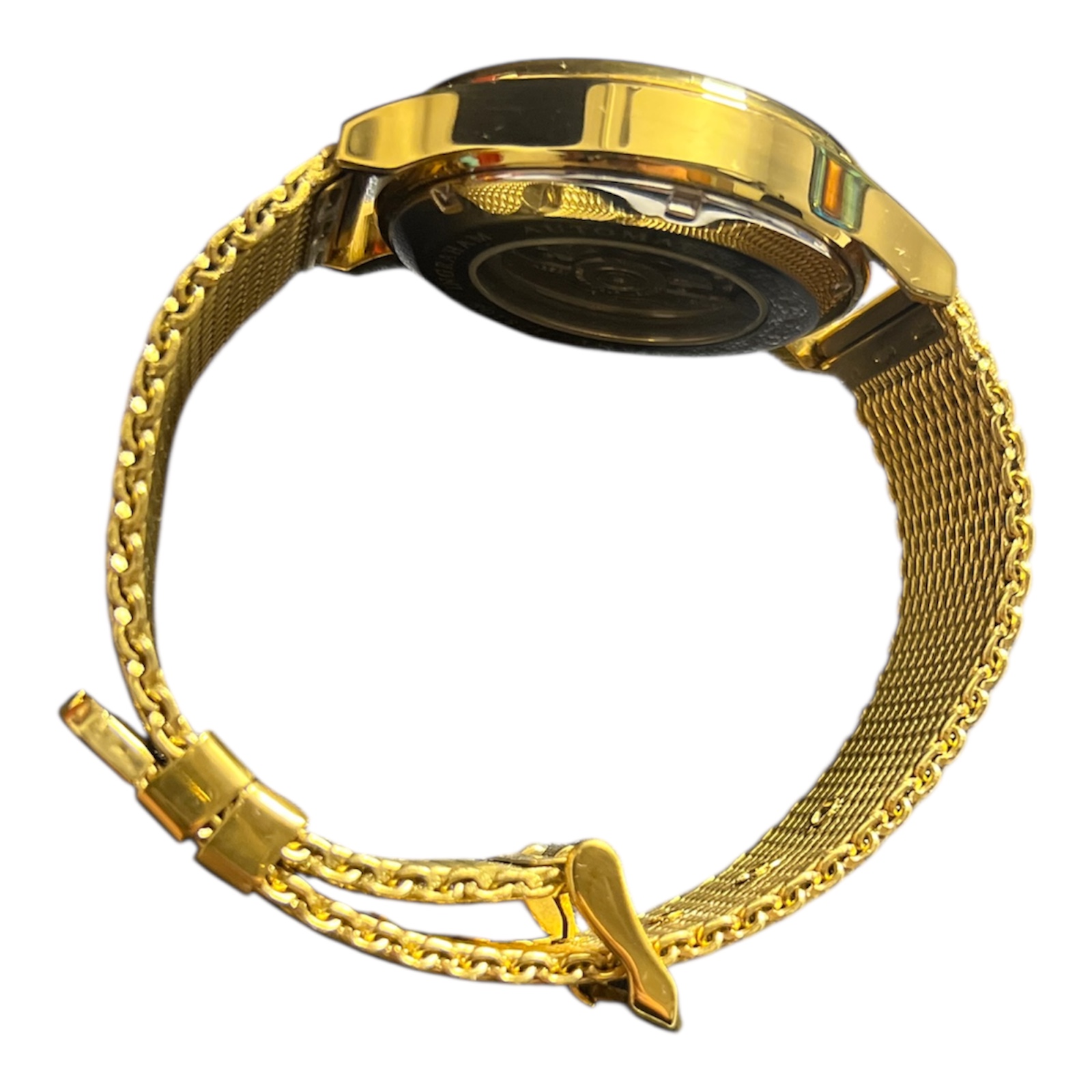 The gold-toned case paired with a black dial, clear Arabic numerals, date display, and a red second hand creates a distinctive and refined appearance. The finely crafted gold Milanese mesh strap provides excellent comfort and a secure fit.