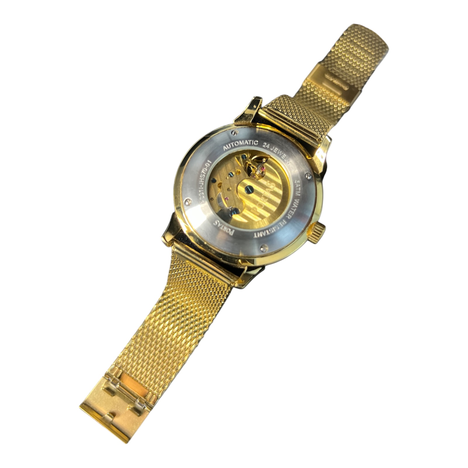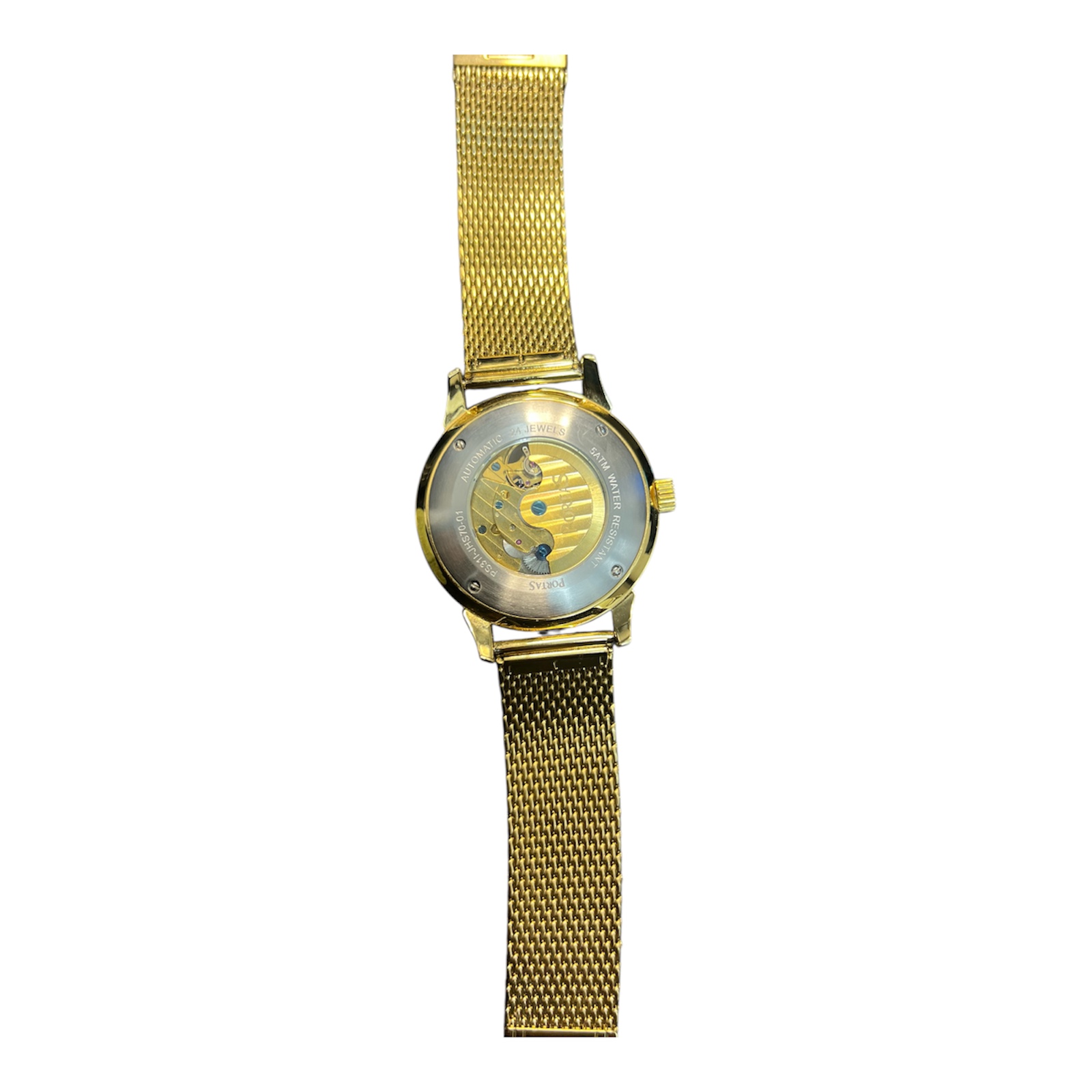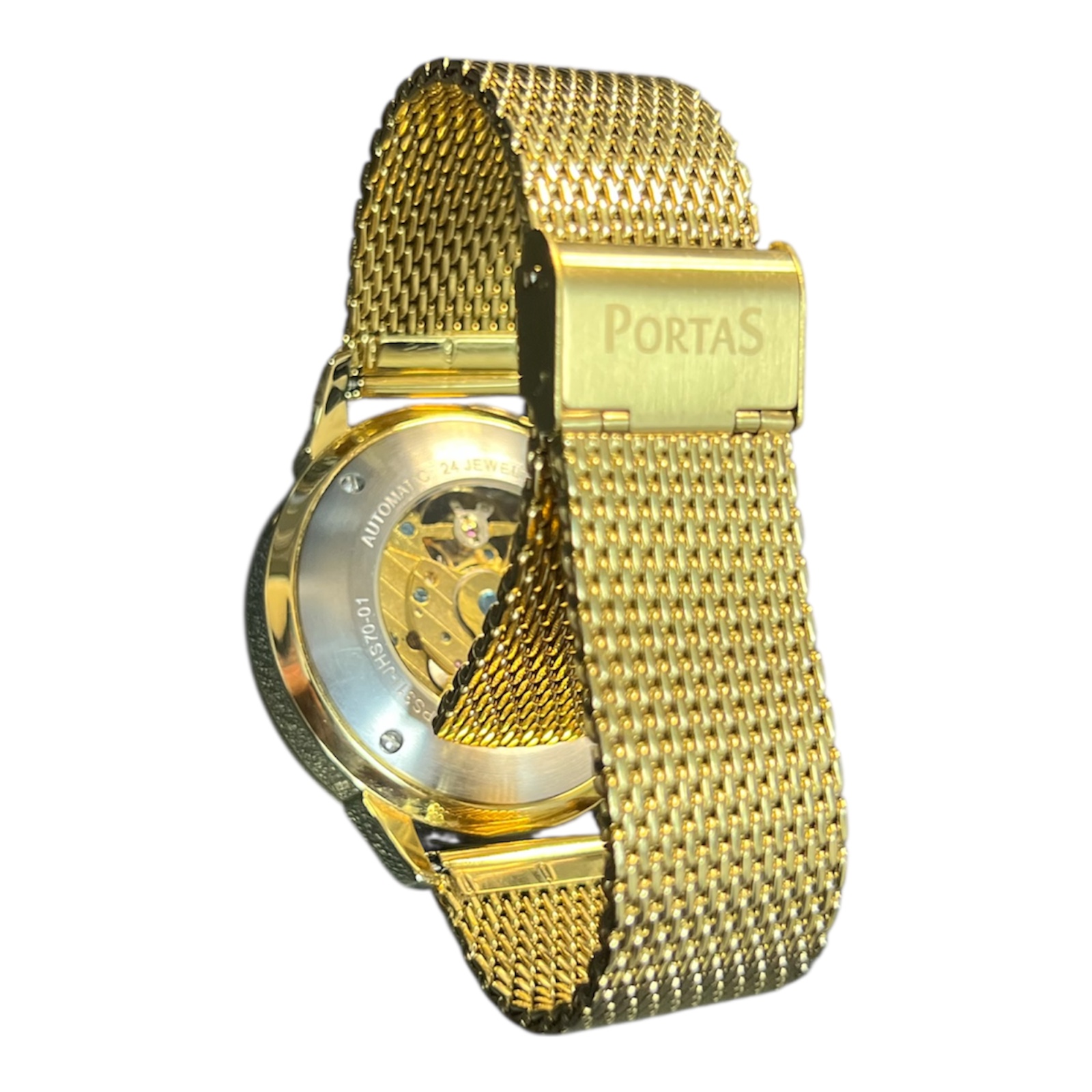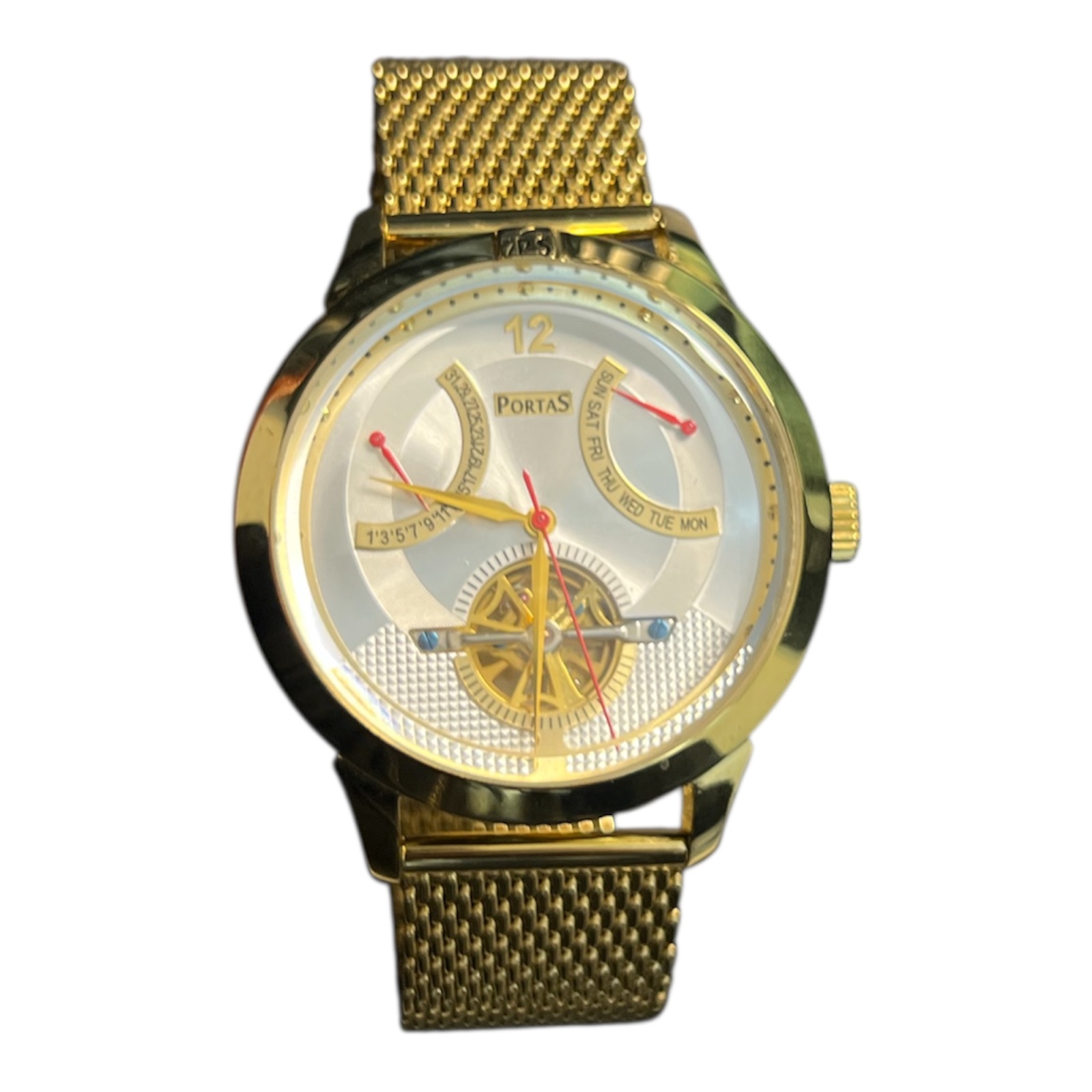 Edle Portas Automatikuhr mit offener Unruh, Tages- und Datumsanzeige sowie goldfarbenem Edelstahl-Mesharmband. Luxuriöses Design mit mechanischer Präzision.